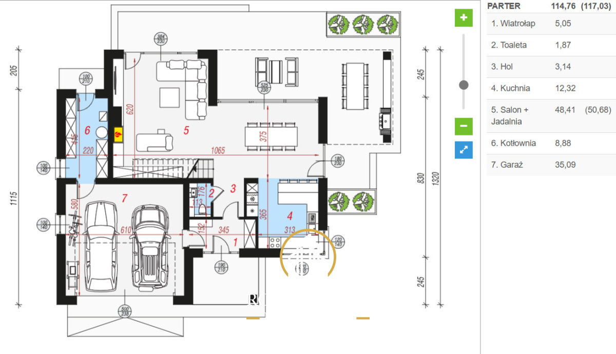 Garaż: dwustanowiskowy, z bezpośrednim przejściem do kotłowni oraz do części mieszkalnej.