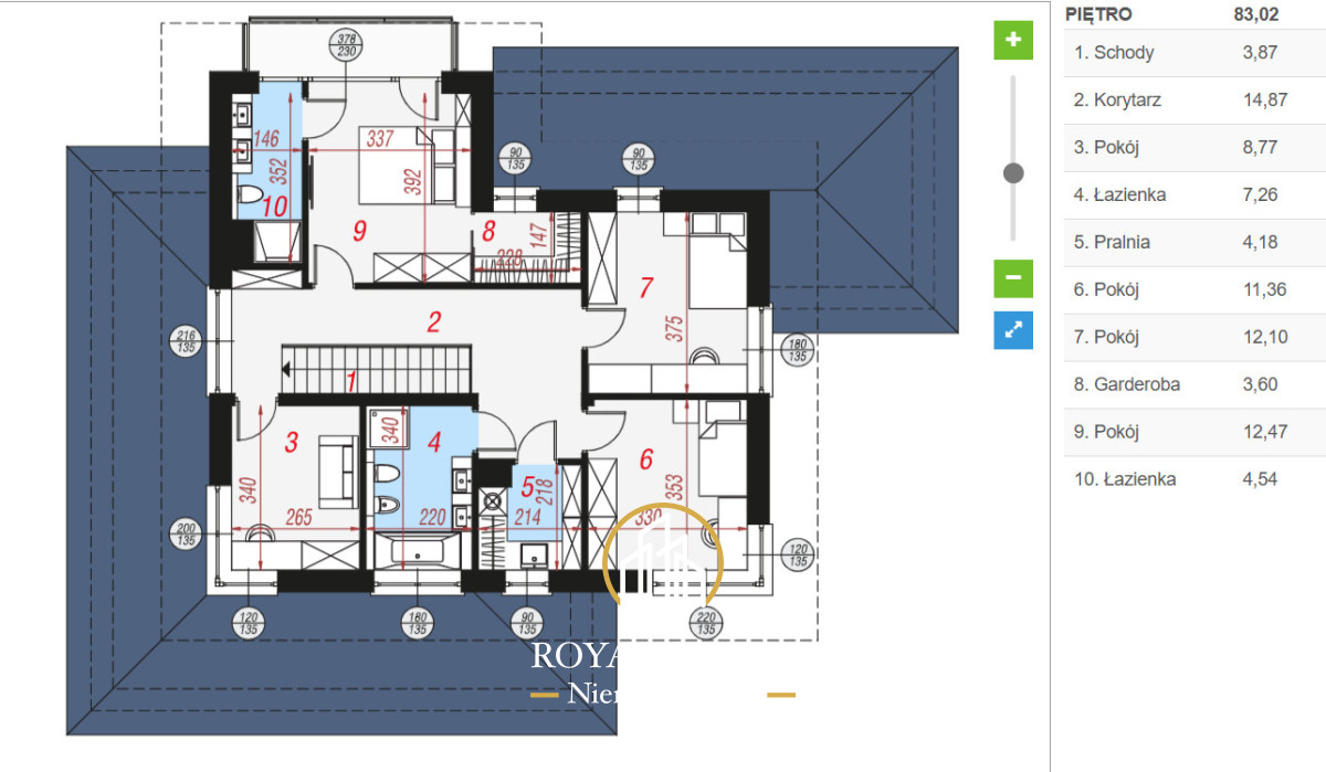 Piętro: hall, gabinet, garderoba, łazienka z wanną i prysznicem, trzy sypialnie (w tym jedna z prywatną łazienką i garderobą).