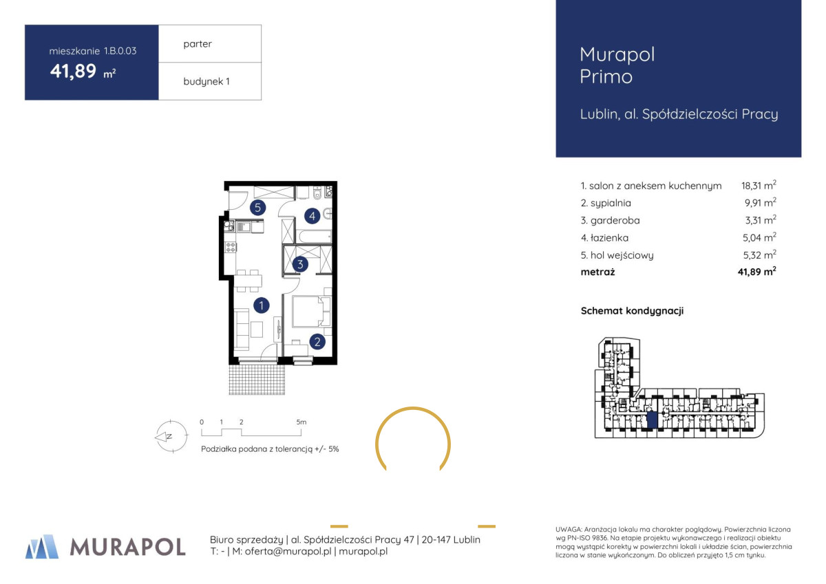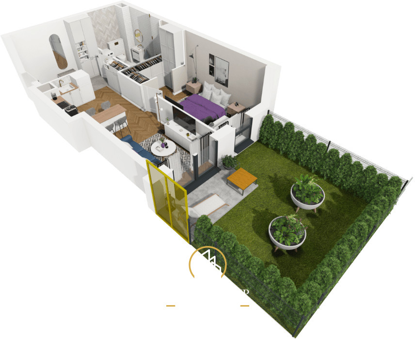 Mieszkanie na parterze o powierzchni 41,89 m2 z ogródkiem!!!. Składa się z pokoju dziennego z aneksem kuchennym 18,31 m2, sypialni 9,91 m2, hol 5,39 m2 i łazienki z toaletą 5,04 m2. Do mieszkania. Możliwość również dokupienia miejsca postojowego w garażu podziemnym oraz komórki lokatorskiej.