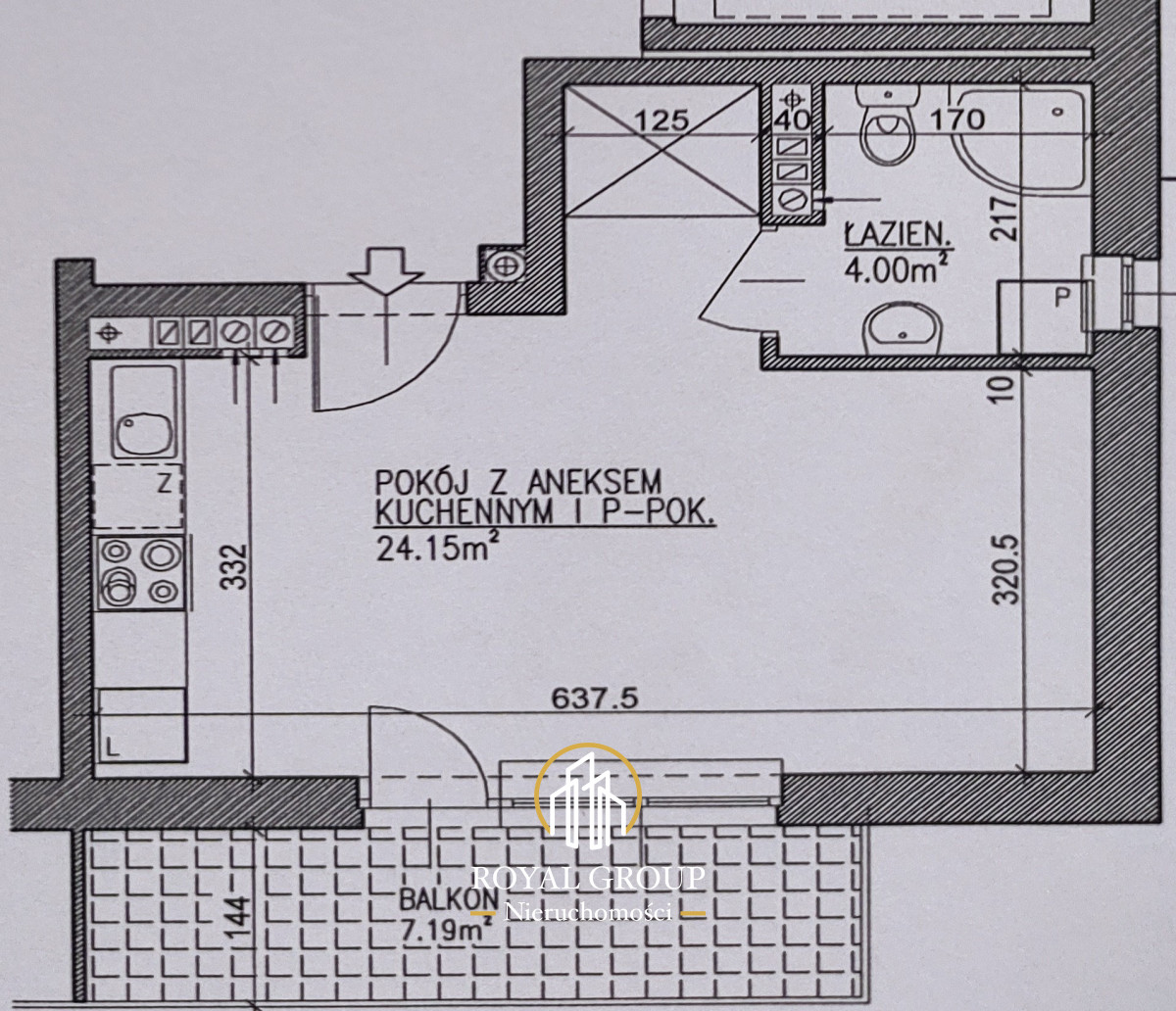Powierzchnia niespełna 28m2 obejmuje pokój z aneksem kuchennym i wyjściem na duży 7m2 balkon, łazienkę z toaletą oraz przedpokój.